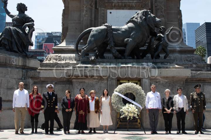 CIUDAD DE MÉXICO, 12SEPTIEMBRE2023.- Alejandra Frausto, secretaria de Cultura; la senadora María Guadalupe Covarrubias Cervantes; Américo Villareal, gobernador de Tamaulipas; María de la Luz Santiago Diez de Bonilla, esposa del gobernador tamaulipeco, y Jesús Ramírez Cuevas, Vocero de la Presidencia, durante la ceremonia conmemorativa a la "Victoria de Tampico de 1829", en el Ángel de la Independencia. FOTO: MOISÉS PABLO/CUARTOSCURO.COM
