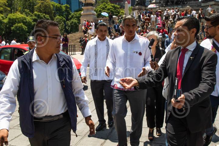 CIUDAD DE MÉXICO, 12SEPTIEMBRE2023.- Américo Villareal, gobernador de Tamaulipas, deja las inmediaciones del Ángel de la Independencia entre escoltas, el mandatario afirmo ante la prensa que su estado no esta secuestrado por el crimen organizado. FOTO: MOISÉS PABLO/CUARTOSCURO.COM