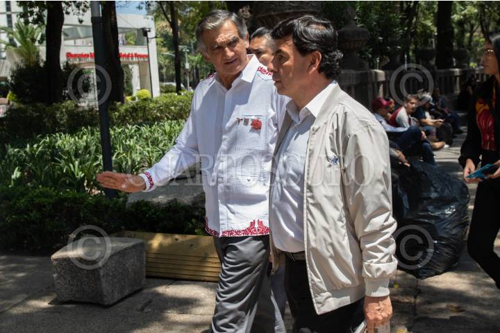 CIUDAD DE MÉXICO, 12SEPTIEMBRE2023.- Américo Villareal, gobernador de Tamaulipas, y Jesús Ramírez Cuevas, Vocero de la Presidencia, conversan sobre avenida Reforma, tras encabezar el evento "Victoria de Tampico de 1829", en el Ángel de la Independencia. FOTO: MOISÉS PABLO/CUARTOSCURO.COM