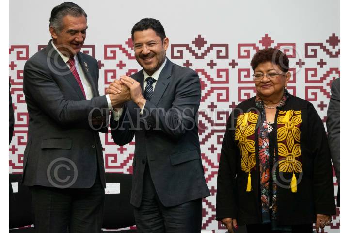 CIUDAD DE MÉXICO, 18OCTUBRE2023.- Martí Batres Guadarrama, jefe de gobierno de la Ciudad de México, Américo Villareal, gobernador del estado de Tamaulipas, y Ernestina Godoy, fiscal general de Justicia de la Ciudad de México, encabezaron la firma de convenio de coordinación entre las dos entidades para el mejoramiento en materia de seguridad. FOTO: GALO CAÑAS/CUARTOSCURO.COM