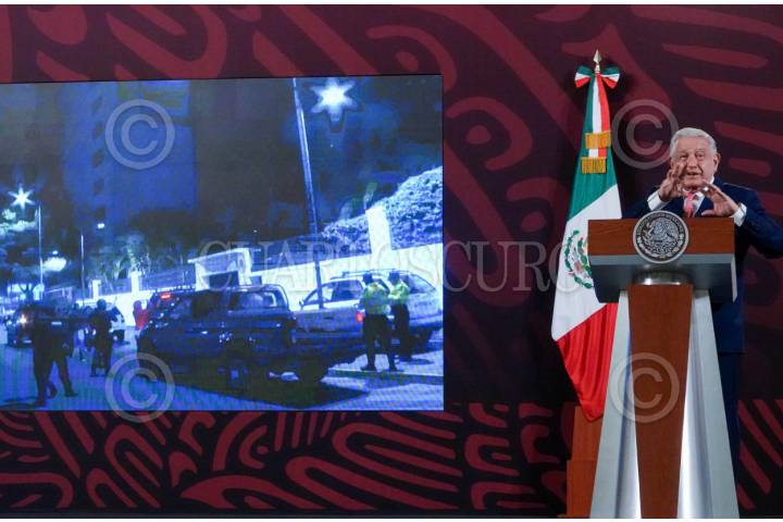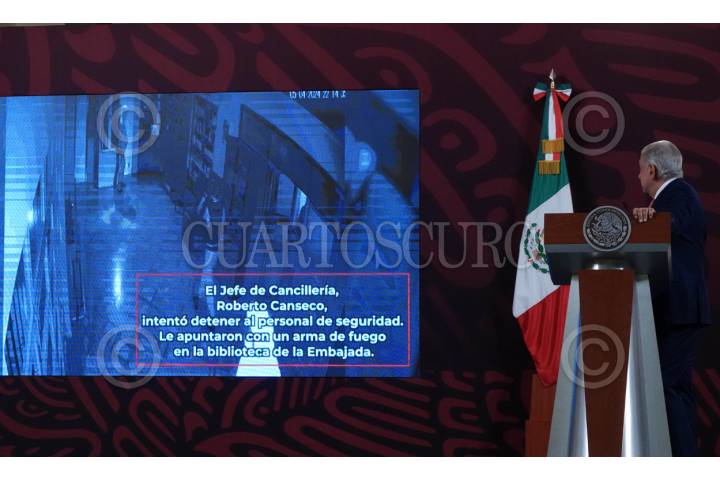 CIUDAD DE MÉXICO, 09ABRIL2024.- Andrés Manuel López Obrador, presidente de México, mostró un vídeo del momento en que la policía ecuatoriana irrumpe en la embajada mexicana para la detención del ex presidente de Ecuador, Jorge Glas, esto durante la conferencia matutina desde Palacio Nacional. FOTO: GALO CAÑAS/CUARTOSCURO.COM