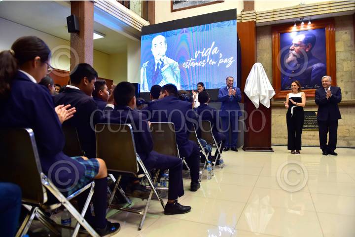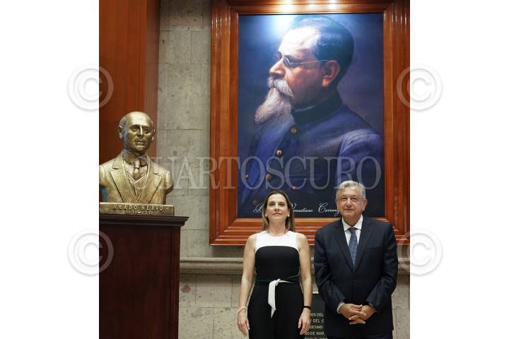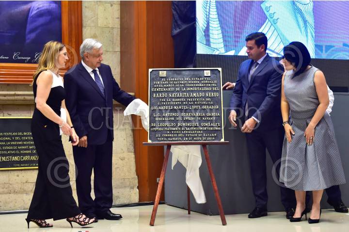 TEPIC, NAYARIT, 28MAYO2019.- Andrés Manuel López Obrador, Presidente de México, y su esposa Beatriz Gutiérrez Müller, encabezaron la sesión solemne en el Congreso de Nayarit para conmemorar el centenario luctuoso del poeta mexicano Amado Nervo. El Jefe del Ejecutivo Federal se dirigió a los diputados del Congreso y a los presentes para hablar sobre el poeta nayarita. FOTO: PRESIDENCIA /CUARTOSCURO.COM
