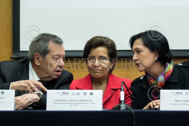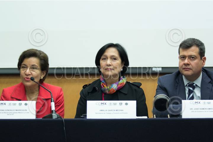 CIUDAD DE MÉXICO, 23ABRIL2018.- Gerardina González Marroquín, directora de la oficina para países México y Cuba de la Organización Internacional del Trabajo; Amalia García, secretaria del Trabajo y Fomento al Empleo de la Ciudad de México, y José Ramón Amieva, jefe de gobierno de la Ciudad de México, durante la inauguración de la 3er semana de la Seguridad Social y el Empleo de la Ciudad de México: ¿Cómo garantizar seguridad social y pensiones dignas a la población trabajadora en México?, en las inmediaciones del Instituto de Investigaciones Económicas de la UNAM. FOTO: GALO CAÑAS /CUARTOSCURO.COM