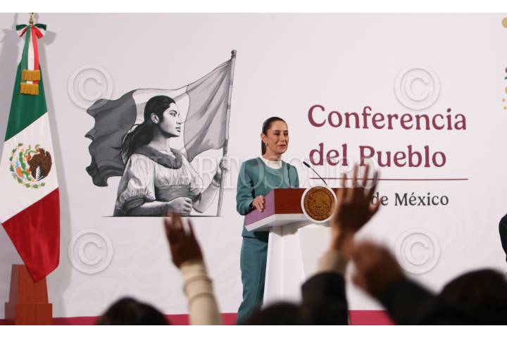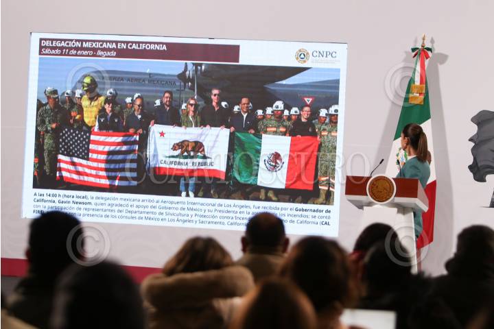 CIUDAD DE MÉXICO, 14ENERO2025.- La presidenta de México, Claudia Sheinbaum, informó en la Conferencia del Pueblo sobre la ayuda humanitaria que brindará una delegación mexicana para combatir los incendios en California. También anunció la inversión de Amazon en el país, destacó los avances en la compra de medicamentos y presentó planes para el desarrollo del ISSSTE. FOTO: GUSTAVO ALBERTO /CUARTOSCURO