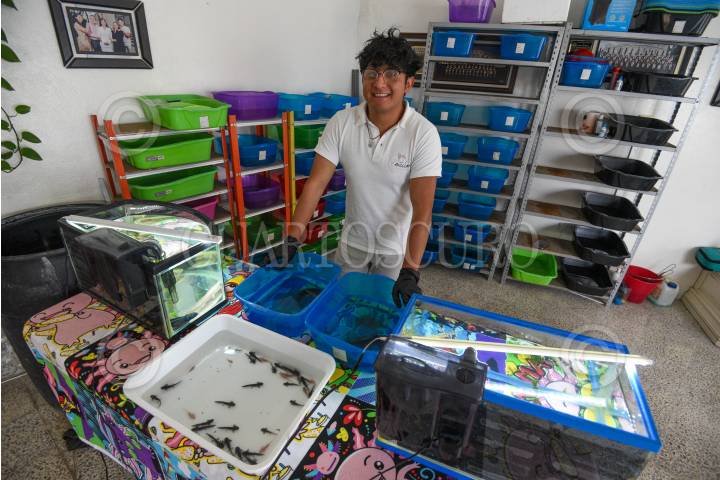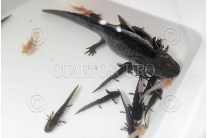 TOLUCA, ESTADO DE MÉXICO, 30ENERO2025.- El próximo 1 de febrero se celebra el Día Nacional del Ajolote, que en náhuatl significa atl, agua y xólotl, monstruo, monstruo de agua, una especie de anfibio que se ha hecho muy popular por estar en los billetes de 50 pesos mexicanos; en Toluca Carlos Andrés Rodríguez maneja la PIMVS Axolcatzin (Predio o instalación que maneja vida silvestre de manera confinada o en cautiverio avalado por SEMARNAT) la cual nace por un amor profundo por los ajolotes que desarrolló desde muy pequeño, que lo llevó a estudiar Biología en la UAEMÉX, se hizo de su primer pareja mientras estudiaba y poco a poco fue aprendiendo de ellos, sobre todo de su reproducción, durante la pandemia profundizo en todo esto y en el 2020 tuvo su primer puesta de huevos. El ajolote a nivel científico pertenece al género que se llama Ambystoma y existen aproximadamente 32 especies, que se distribuyen de la parte sur de Canadá hasta la parte central de México, en donde tenemos 18 especies endémicas. En el criadero se dedican a reproducir, conservar y dar pláticas sobre la importancia de esta especie sobre todo de tres de ellas, Ambystoma andersoni o ajolote jaguar de la laguna de Zacapu en Michoacán, Ambystoma mexicanum o ajolote mexicano del Lago de Xochimilco y el Ambystoma dumerilli del Lago de Pátzcuaro, a través de estos 6 años han logrado reproducir y conservar más de 3500 ajolotes y esa cifra va creciendo poco a poco. El ajolote se encuentra en peligro de extinción debido a la venta y caza ilegal para consumo propio, reducción de su hábitat, contaminación en la zona en donde se encuentran y también la introducción de especies invasoras como la trucha, carpa y tilapia reducen la población de ajolotes, y actualmente los anfibios enfrentan un problema muy grande por el cambio climático. Los ajolotes son hábitos carnívoros se alimenta principalmente de lombrices pequeñas y muchos tipos de insectos acuáticos, peces pequeños, en vida libre viven entre 7 y 8 años y en cautiverio llegan a vivir entre 12 o 13 años y se puede alargar su vida, se puede tener un ajolote como mascota en casa pero se recomienda que sean adquiridos en lugares avalados por SEMARNAT y no se fomente la venta ilegal que es un grave problema para su conservación. FOTO: CRISANTA ESPINOSA AGUILAR /CUARTOSCURO.COM