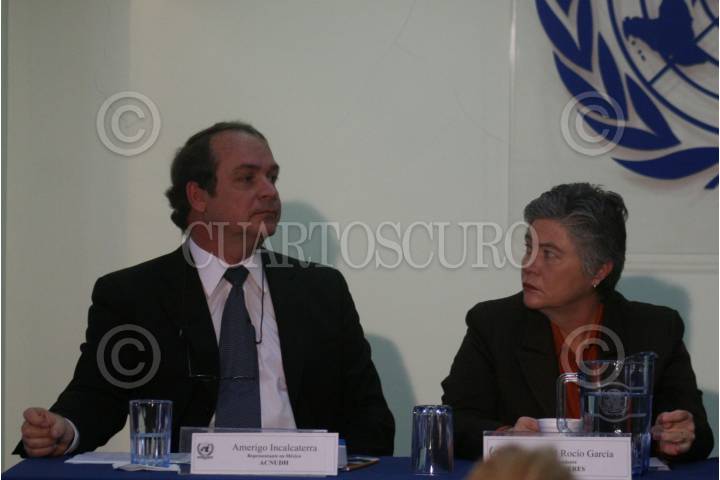 MÉXICO,D,F.,21 NOVIEMBRE2007.- Amerigo Incalcaterra Representante en México de la ACNUDH, Maria del Rocío García Presidenta de INMUJERES, durante la presentación de la campaña de los 16 días de activismocontra la violencia. FOTO:SASHENKA GUTIERREZ/CUARTOSCURO.COM