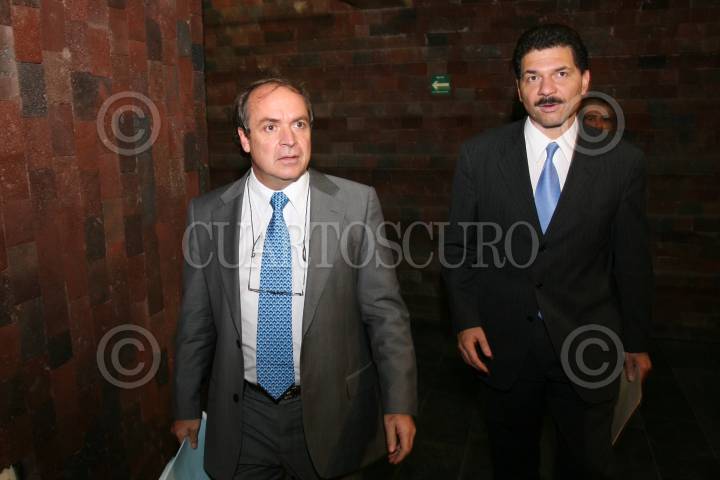 MÉXICO D.F. 12DICIEMBRE2006.- Amerigo Icalcaterra representante del alto comisionado de la ONU y el senador Manlio Flavio Beltrones y el senador Santiago Creel Miranda durante lafirma del convenio de cooperación con la comisión de derechos humanos del senado. FOTO: GUILLERMO PEREA /CUARTOSCURO.COM