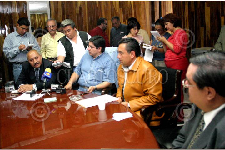 MÉXICO D.F. 15AGOSTO2007.-Fernando Amescua Secretario General del Sindicato de Electricistas, Francisco Javier Farin, representante nacional de trabajadores de Geografía y Estadistica durante la conferencia donde denunció el maltrato a los trabajadores y los malos manejos del presupuesto de este organismo, esto en las intalaciones del Sindicato de Electricistas.En la imagen son acompañados por Erik Cheu y María Consuelo trabajadores de esta dependencia quienes an sufrido de maltrato por parte de sus superiores. FOTO:GULLERMO PEREA/CUARTOSCURO.COM