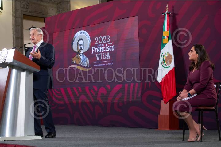 Andrés Manuel López Obrador y Laura Elena Carrillo durante la conferencia matutina desde Palacio Nacional