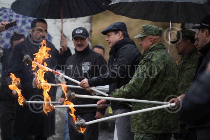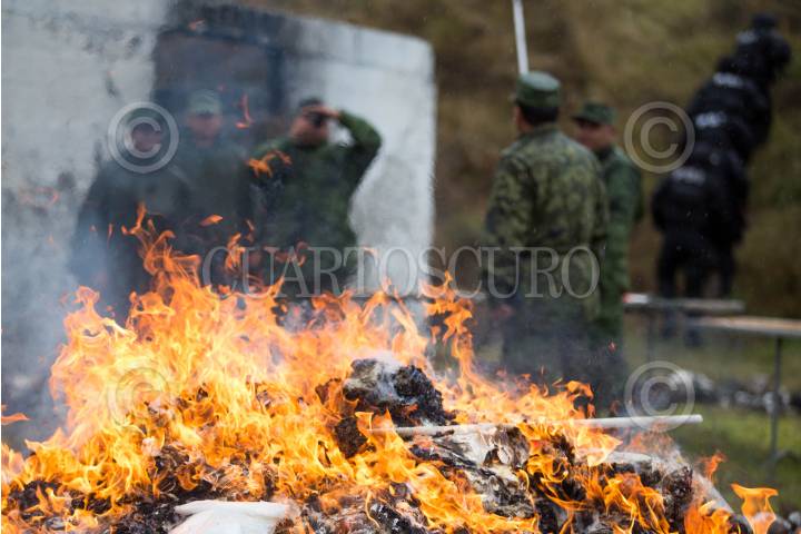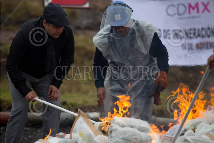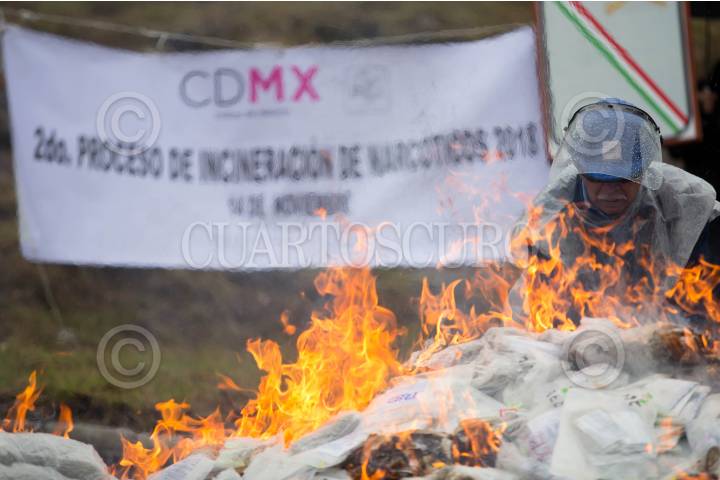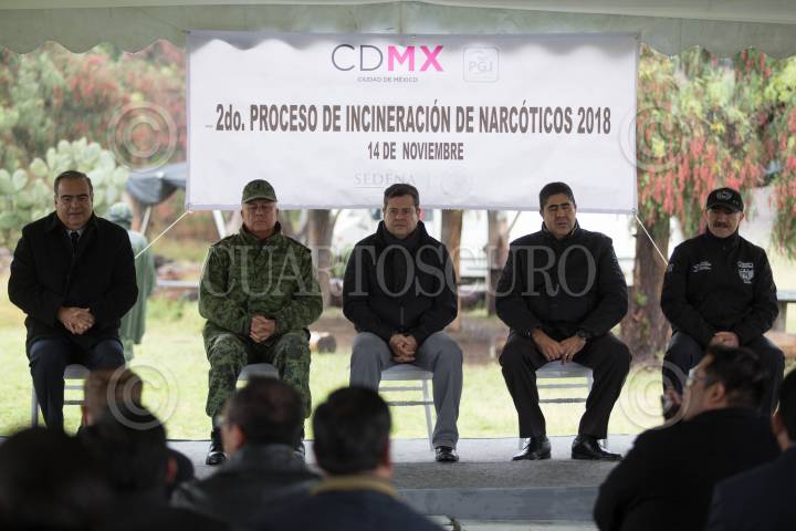 SAN JUAN TEOTIHUACÁN, ESTADO DE MÉXICO, 14NOVIEMBRE2018.- Se realizó el Segundo Proceso de Incineración de Narcóticos 2018 en instalaciones del 5º Regimiento de Artillería de la 37º Zona Militar, evento encabezado por el Jefe de Gobierno capitalino, José Ramón Amieva, el procurador, Edmundo Garrido Osorio y el Secretario de Seguridad Pública, Raymundo Collins Flores con representantes de la Secretaría de la Defensa Nacional (Sedena); desintegraron en total 112 kilos de diversos estupefacientes decomisados en acciones contra el narcomenudeo. FOTO: ILSE HUESCA /CUARTOSCURO.COM