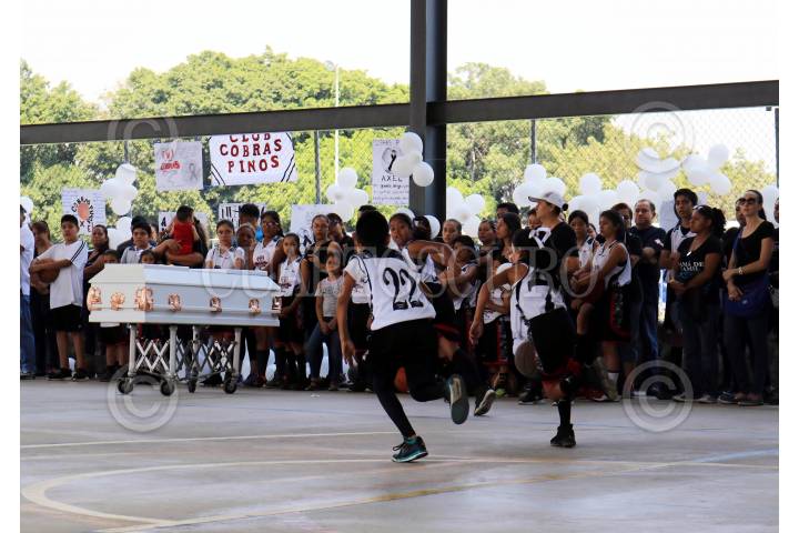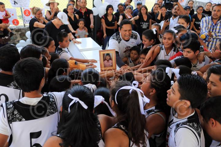 CUERNAVACA, MORELOS, 23ABRIL2019.- Padres del niño Axel, acompañados de sus familiares, amigos y compañeros del equipo de basquetbol Cobras Pinos le rinden un homenaje con un partido de este deporte en la cancha de usos múltiples de la colonia popular Satélite. El niño Axel Gael, de 10 años, ingresó el pasado domingo al hospital del IMSS de esta ciudad con un disparo de arma de fuego en el pecho, presuntamente una bala perdida resultado de una riña en su calle. El menor ingresó al hospital y murió horas después. FOTO: MARGARITO PÉREZ RETANA /CUARTOSCURO.COM