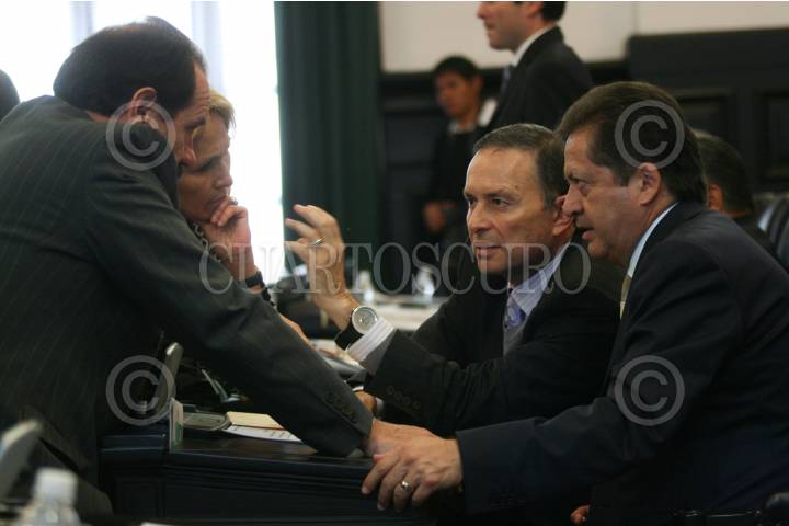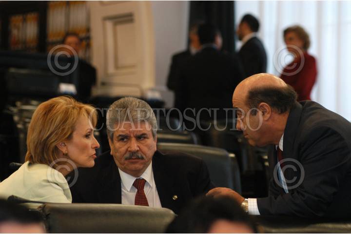 MÉXICO, D.F., 27OCTUBRE2009.- Los senadores Juan Buenotorio, Amira González, Fernando Trenti, José Isabel Trejo Presidente de la Comisión de Hacienda en la Cámara de Senadores conversan durante la sesión ordinaria en el recisnto de Donceles. FOTO: SÁSHENKA GUTIÉRREZ/CUARTOSCURO.COM