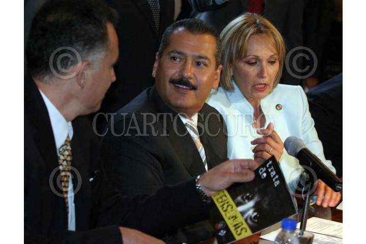 MÉXICO, D.F., 20JUNIO2007.- Luis Manuel Fuentes, Manlio Fabio Beltrones, presidente de la mesa directiva de la Comisión Permanente y Amira Griselda Gómez, senadora del PRI, ofrecieron una conferencia de prensa para hablar sobre las mesas de analisis sobre el tema de trata de personas que se realizarán en la sede del senado de la República. FOTO: MOISÉS PABLO/CUARTOSCURO.COM