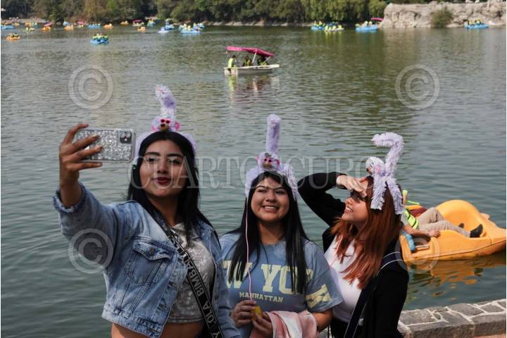 CIUDAD DE MÉXICO, 19ENERO2025.-Con changuitos en la cabeza, un grupo de amigas se toma una selfie frente el Lago del Bosque de Chapultepec. FOTO: GRACIELA LÓPEZ/CUARTOSCURO.COM