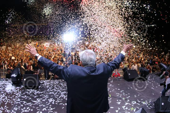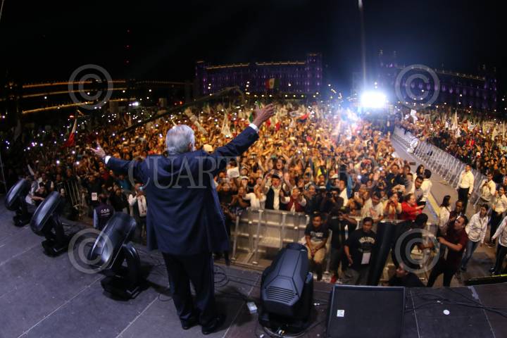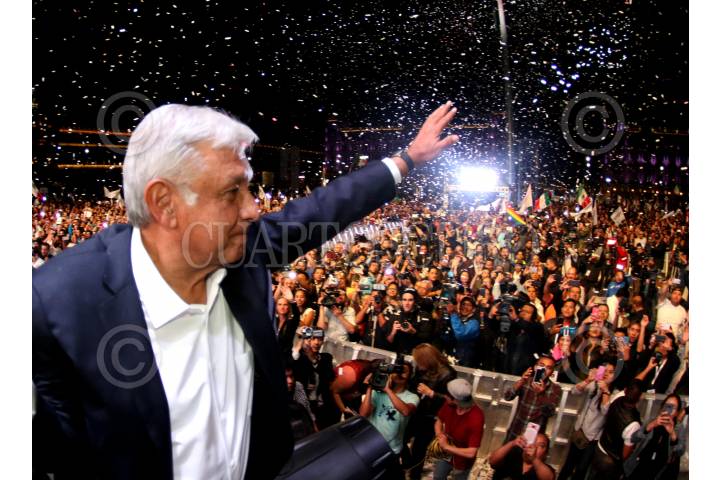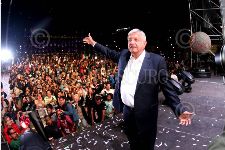 CIUDAD DE MÉXICO, 01JULIO2024.- Se conmemoran seis años del triunfo de Andrés Manuel López Obrador (AMLO) en las elecciones del primero de julio de 2018. Fue electo presidente de México como candidato de la coalición Juntos Haremos Historia, conformada por Morena, Partido del Trabajo y Partido Encuentro Social, con 53.19% los votos. En la foto Andrés Manuel Lopez Obrador, virtual ganador de la presidencia de la república a su llegada al Zócalo de la Ciudad de México. FOTO: SAÚL LÓPEZ /CUARTOSCURO.COM