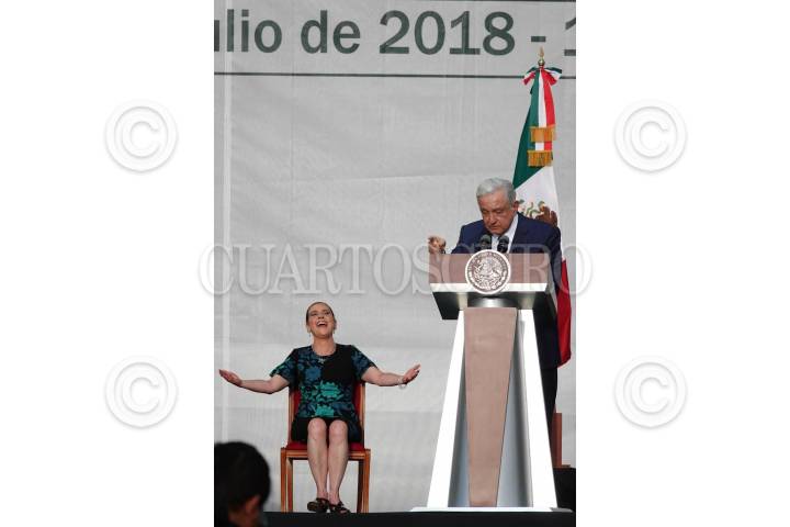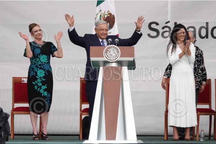 Andrés Manuel López Obrador, presidente de México, acompañado de su esposa Beatriz Gutiérrez Müller, durante su llegada al Festejo por los 5 años del Triunfo Democrático para la Transformación de México realizado en el Zócalo capitalino