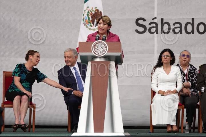 Delfina Gómez, gobernadora del Estado de México, durante su participación en el Festejo por los 5 años del Triunfo Democrático para la Transformación de México realizado en el Zócalo capitalino