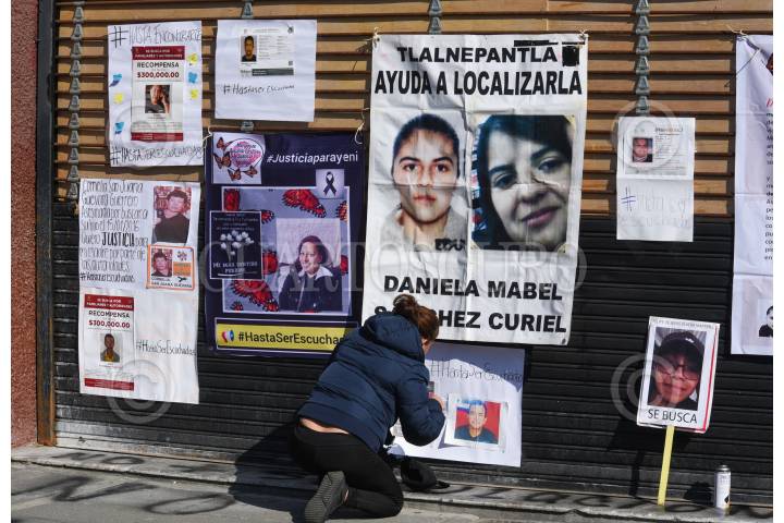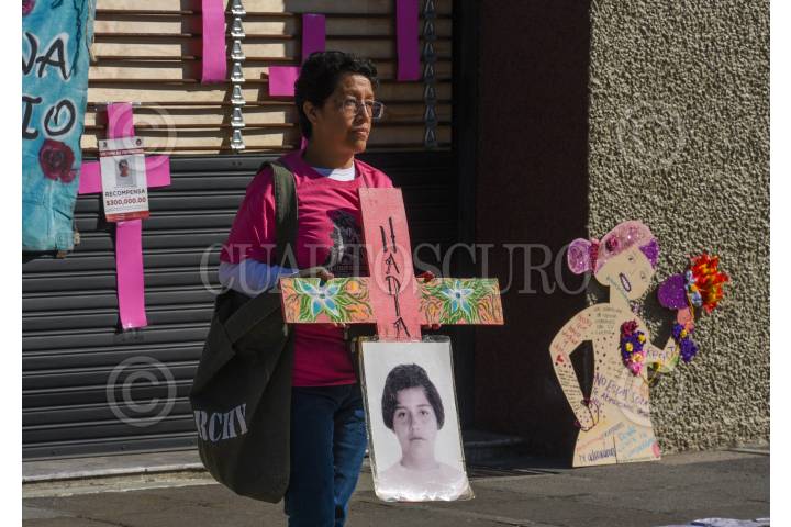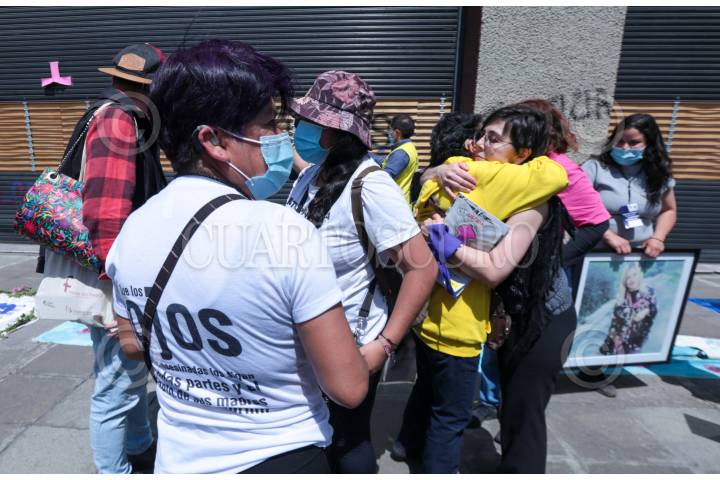 María Antonina Márquez, Laura Curiel, Lidia Florencio y Ana Sosa, madres de Nadia Muciño, Daniela Sánchez, Diana Velázquez y Julia Sosa, durante la inauguración del Mural Itinerante "Hasta Ser Escuchadas", cuyo objetivo es honrar la memoria de mujeres desaparecidas en México y víctimas de feminicidio. Fue instalado en el Salón Benito Juárez de la Cámara de Diputados local.