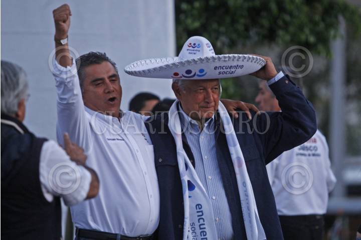 GUADALAJARA, JALISCO, 11FEBRERO2018.- Gonzálo Moreno, presidente de Encuentro Social en Jalisco, le regalo un sombrero de charro a Andrés Manuel López Obrador AMLO pre candidato a la Presidencia de la Republica por el Partido MORENA, durante el cierre de precampaña del tabasqueño en la Glorieta de los Niños Héroes. FOTO: FERNANDO CARRANZA GARCIA /CUARTOSCURO.COM