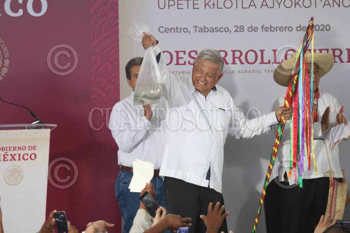 Andrés Manuel López Obrador, presidente de México, fue recibido por habitantes indígenas en la Villa Tamulte de las Sabanas, donde realizó la presentación del Programa de Mejoramiento Urbano y Diálogo con el Pueblo Yokot’an de Tabasco