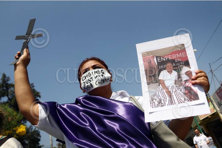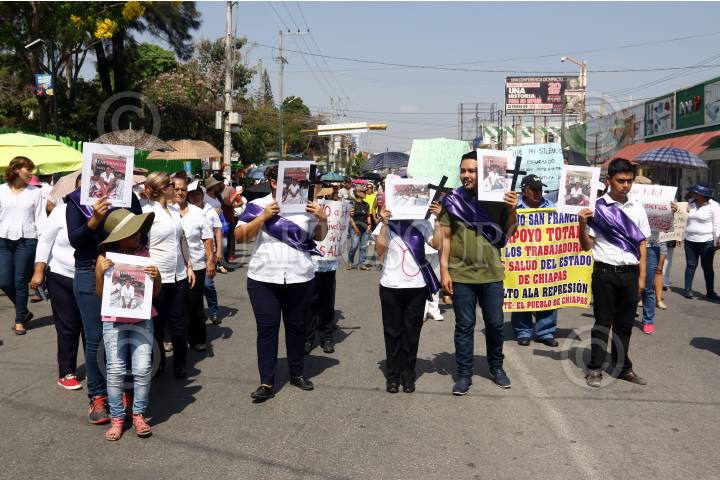 TUXTLA GUTIÉRREZ, CHIAPAS, 10ABRIL2017.- Maestros pertenecientes a la Coordinadora Nacional de Trabajadores de la Educación (CNTE), marcharon en apoyo a las enfermeras que se mantienen en huelga de hambre en la capital chiapaneca. Hoy, cinco de las ocho enfermeras se amordazaron para no consumir líquidos durante 10 horas. Este lunes se cumplen ocho días de haber iniciado la huelga de hambre, ya que exigen solución al pago de adeudos, prestaciones laborales y el abasto de medicamentos. FOTO: JESÚS GARCÍA / CUARTOSCURO.COM