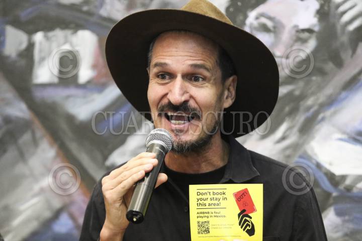 CIUDAD DE MÉXICO, 18JULIO2025.- Parte de la propaganda que se repartió en la conferencia de prensa del Frente por el Arraigo y la Inclusión Vecinal, respecto al amparo vecinal presentado en contra del Gobierno de la Ciudad por incumplir la normativa que regula Airbnb. Efren Murillo, Sergio González, Ameyalli Magallón y Arturo Aparicio, en el encuentro con medios. FOTO: VICTORIA VALTIERRA/CUARTOSCURO.COM