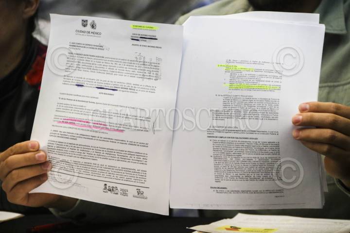 CIUDAD DE MÉXICO, 18JULIO2025.- Documento del amparo vecinal presentado por el Frente por el Arraigo y la Inclusión Vecinal en contra del Gobierno de la Ciudad, por incumplir la normativa que regula Airbnb. La acción legal fue anunciada durante una conferencia de prensa. Efren Murillo, Sergio González, Ameyalli Magallón y Arturo Aparicio, presentes en el encuentro con medios. FOTO: VICTORIA VALTIERRA/CUARTOSCURO.COM