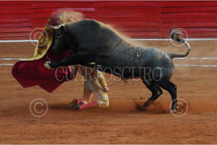 CIUDAD DE MÉXICO, 04FEBRERO2024.-Uno de los toros sale y enfrenta a su torero en la primer corrida de la tarde en la Plaza de Toros. FOTO: DANIEL AUGUSTO /CUARTOSCURO.COM
