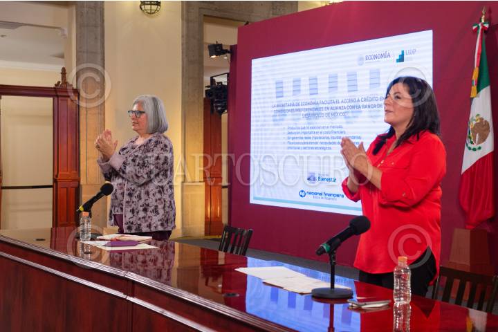 Graciela Márquez Colín, y Ana Bárbara Mungaray Moctezuma, durante la conferencia de entrega de créditos en Palacio Nacional.