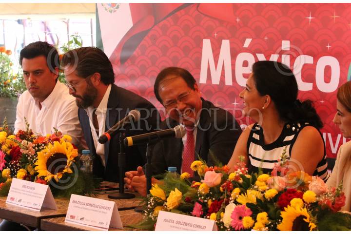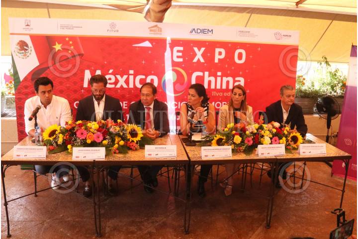 CUERNAVACA, MORELOS, 08NOVIEMBRE2023.- De izquierda a derecha los empresarios Federico Matamoros y Javier Porras, Bao Ronglin, presidente de la Cámara de Inversión y Comercio Yangtzé River México China y director general de Bicicletas Bimex, Ana Cecilia Rodríguez, secretaria de Desarrollo Económico y del Trabajo, Julieta Goldzweing, secretaria de Turismo y Cultura y el director del Fideicomiso del Fondo de Competitividad, y Promoción del Empleo, Juan Diego Pons durante la presentación de la Expo México China que se llevará a cabo del 15 al 17 de noviembre en el Centro de Convenciones Morelos. FOTO: MARGARITO PÉREZ RETANA / CUARTOSCURO.COM