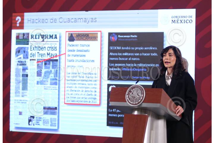 Ana Elizabeth García Vilchis, directora de Redes de la Coordinación General de Comunicación Social y Vocería de Presidencia, durante su participación en la conferencia de prensa realizada en el Salón Tesorería de Palacio Nacional.
