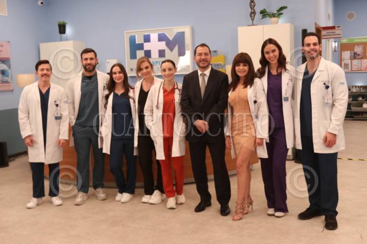 CIUDAD DE MÉXICO, 07AGOSTO2025.- Adrián Ortega Echegollén, director de contenidos de TV Azteca, acompañado del elenco principal de la serie "Dra. Lucía: Un Don Extraordinario" durante la presentación de la tercera temporada en Azteca Estudios. FOTO: GRACIELA LÓPEZ/CUARTOSCURO.COM