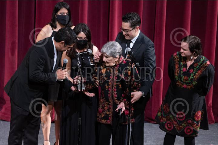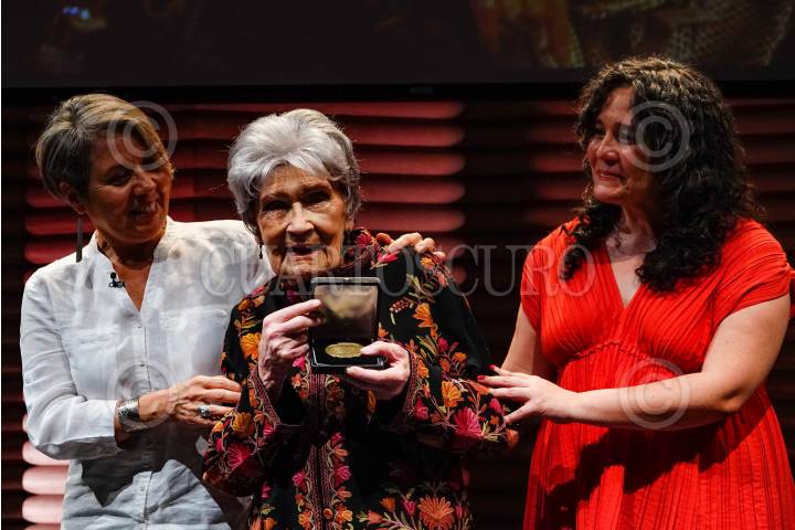 La actriz Ana Ofelia Murguía durante la ceremonia de entrega del la Medalla Cátedra Ingmar Bergman en el auditorio del MUAC.