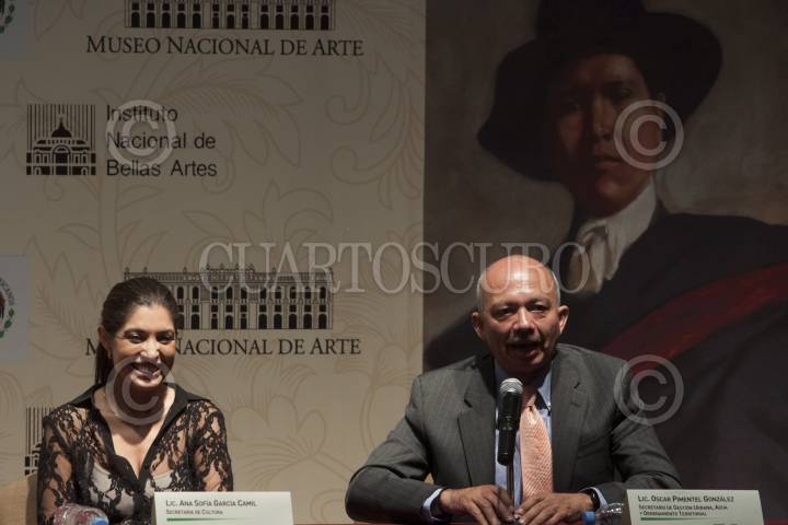 MÉXICO, D.F., 29AGOSTO2012.- Ana Sofía García Camil, secretaría de Cultura de Coahuila, y Oscar Pimentel González, secretario de Gestión Urbana Agua y Ordenamiento Territorial de Coahuila, durante la conferencia de prensa en la cual se hablo de la exposición del pintor zacatecano-coahuilense "Rubén Herrera, trazos y volumen" que se presentará en el Museo Nacional de Arte. FOTO: MOISÉS PABLO /CUARTOSCURO.COM