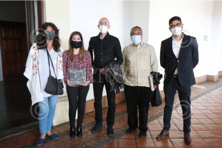 Elideth Fernández, ganadora del segundo lugar; Ana Sofía García Camil, secretaria de Cultura de la entidad; Duilio Rodríguez, tercer lugar; Pedro Valtierra, director de Cuartoscuro, y Alejandro Cerraga, primer lugar, previó al inicio del Sexto Concurso nacional de Fotografía "Los Derechos Humanos".
