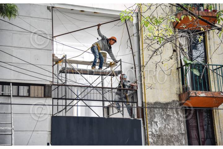 CIUDAD DE MÉXICO, 28SEPTIEMBRE2017.- Edificios y casas habitacionales de la colonia Narvarte, continúan desalojadas después de los daños estructurales que sufrieron debido al sismo de 7.1 grados del pasado 19 de septiembre. En la imagen trabajadores refuerzan la fachada de una casa ubicada en Anaxagoras y Miguel Alemán. FOTO: MARIO JASSO /CUARTOSCURO.COM