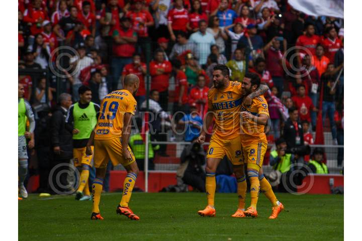 André-Pierre Ginac delantero de Tigres celebra su anotación ante los Diablos de Toluca la cual les dio su pase a semifinales, con un marcador global ante Diablos 5-4 en el estadio Nemesio Diez.