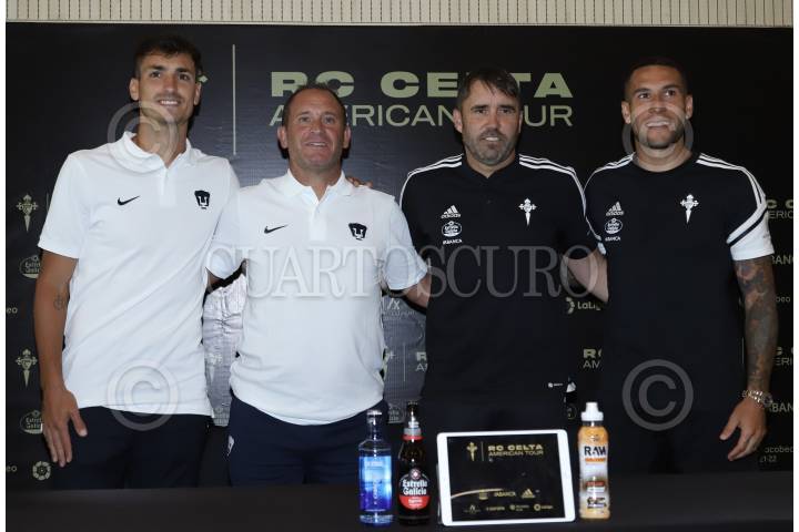 Juan Dinenno, Andrés Lillini, Eduardo Coudet y Hugo Mallo durante la conferencia de prensa con el Real Club Celta de Vigo en su gira por el continente Americano y del club Pumas de la UNAM, previo a su juego amistoso en el Estadio Olímpico Universitario.