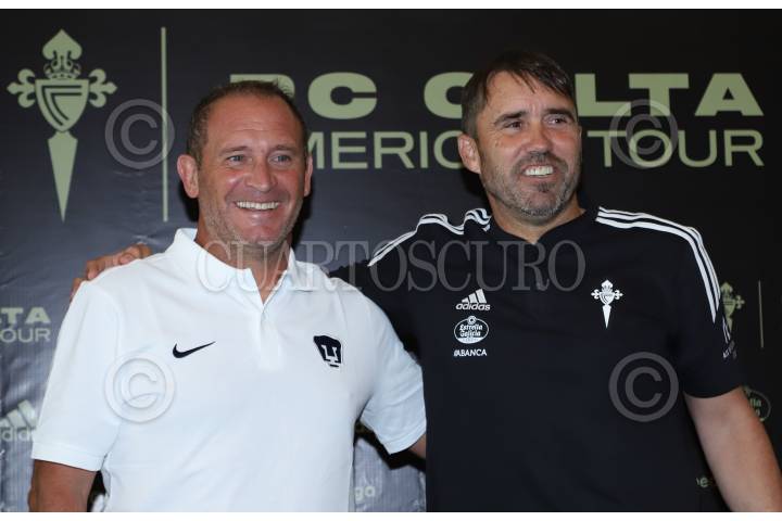 Los Directores Técnicos Andrés Lillini y Eduardo Coudet durante la conferencia de prensa con el Real Club Celta de Vigo en su gira por el continente Americano y del club Pumas de la UNAM, previo a su juego amistoso en el Estadio Olímpico Universitario.