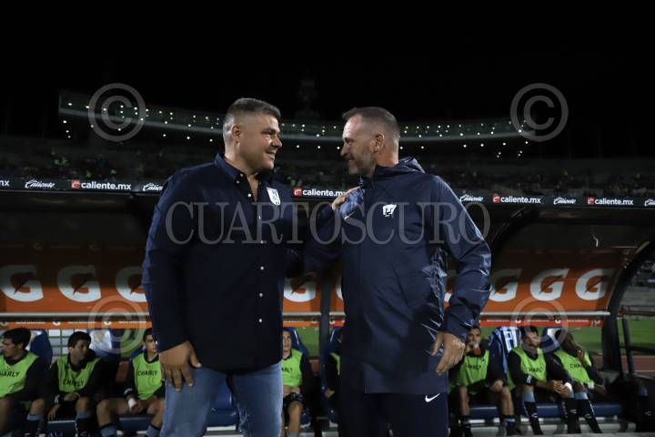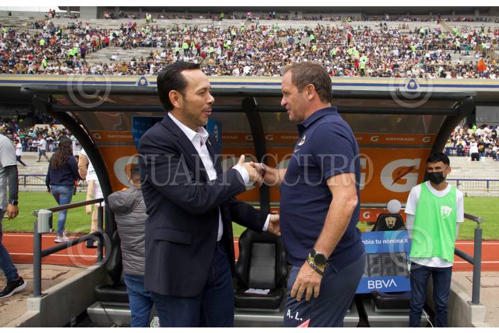 Los Directores Técnicos Marion Gerk y Andrés Lillini durante el partido de fútbol Pumas vs Querétaro correspondiente a la jornada 13 del Torneo Apertura 2022 de Liga BBVA MX, en el estadio Olímpico Universitario.