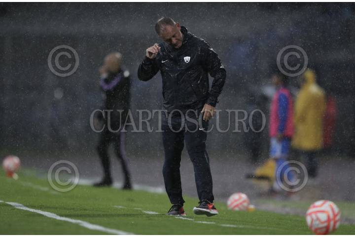 El DT Andrés Lillini se lamenta bajo la lluvia durante el partido de fútbol Pumas vs Cruz Azul correspondiente a la jornada 15 del Torneo Apertura 2022 de Liga BBVA MX, en el estadio Olímpico Universitario.