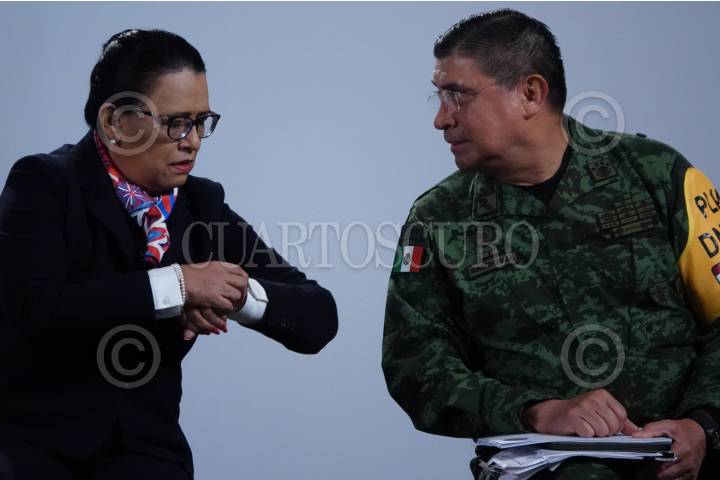 Rosa Icela Rodríguez y Luis Cresencio Sandoval durante la conferencia matutina sobre seguridad en Palacio Nacional