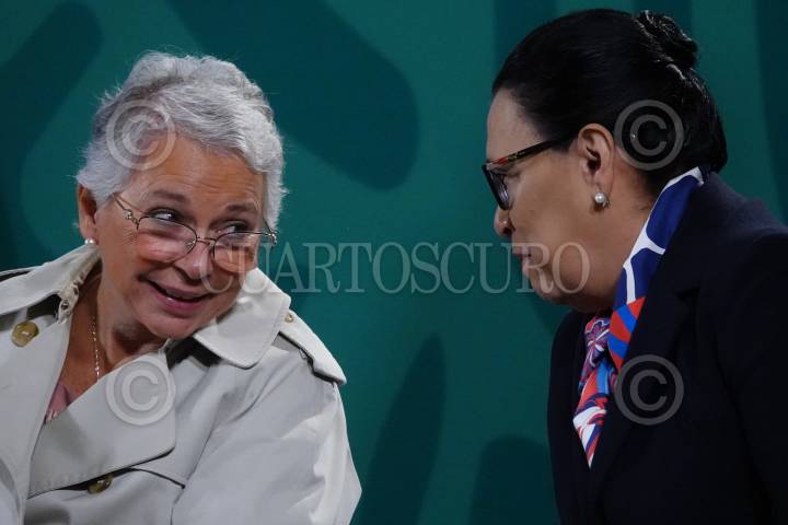 Olga Sánchez Cordero y Rosa Icela Rodríguez durante la conferencia matutina sobre seguridad en Palacio Nacional