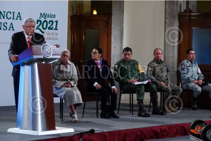 Andrés Manuel López Obrador, Olga Sánchez Cordero, Rosa Icela Rodríguez, Luis Cresencio Sandoval, Rafael Ojeda y Luis Rodrígue Bucio durante la conferencia matutina sobre seguridad en Palacio Nacional