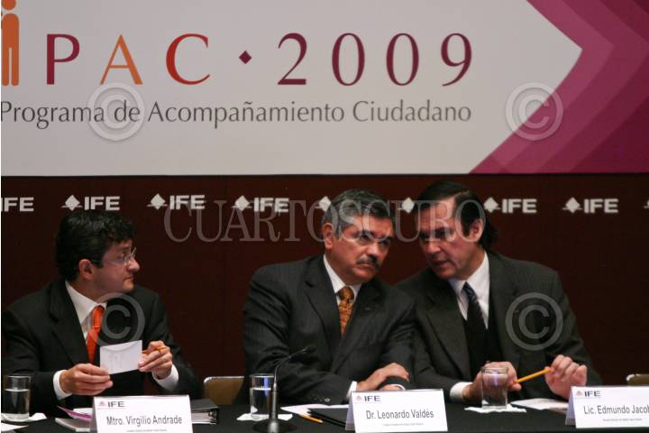 MÉXICO, D.F., 25FEBRERO2009.- El consejero Virgilio Andrade, Leonardo Valdez Zurita, consejero presidente del IFE y Edmundo Jacobo, secretario ejecutivo durante la presentación del Programa de Acompañamiento Ciudadano, acto que se realizo en el auditorio del Instituto Federal Electoral (IFE). FOTO: RODOLFO ANGULO/CUARTOSCURO.COM