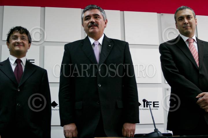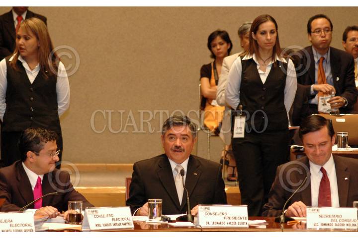 MÉXICO D.F., 05JULIO2009.- El consejero Virgilio Andrade, el consejero presidente Leonardo Valdéz Zurida y el secretario ejecutivo Edmundo Jacobo molina durante la reanudación de la sesión permanente que se realizo esta noche en el salón de plenos del Instituto Federal Electoral (IFE) en este día de jornada electoral que se celebro en todo el país. FOTO: RODOLFO ANGULO/CUARTOSCURO.COM