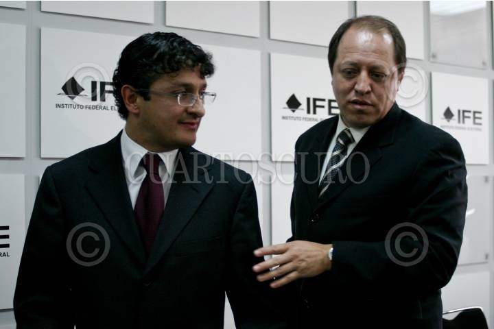 MÉXICO D.F., 05JULIO2009.-El consejero Virgilio Andrade y el consejero presidente Leonardo Valdéz Zurita antes de la reanudación de la sesión permanente que se realizo esta noche en el salón de plenos del Instituto Federal Electoral (IFE) en este día de jornada electoral que se celebro en todo el país. FOTO: RODOLFO ANGULO/CUARTOSCURO.COM