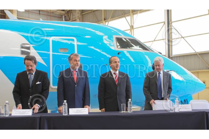 TLAJOMULCO DE ZUÑIGA, JALISCO 10MARZO2009.- Felipe Calderón, Presidente de México, en compañía de Juan Molinar, Secretario de Comunicaciones y Transporte, Emilio Gonzalez Marquez Gobernador del estado de Jalisco y Gaston Azcarraga Andrade, Presidente del Consejo de Administración de Grupo Mexicana, a su llegada a la base de mantenimiento de Mexicana en el Aeropuerto Internacional 'Miguel Hidalgo' en Tlajomulco de Zuñiga. FOTO: ALFREDO GUERRERO/CUARTOSCURO.COM
