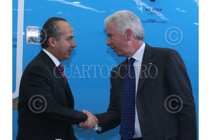 TLAJOMULCO DE ZUÑIGA, JALISCO 10MARZO2009.- Felipe Calderón, Presidente de México, saludando a Gaston Azcarraga Andrade, Presidente del Consejo de Administración de Grupo Mexicana, a su llegada a la base de mantenimiento de Mexicana en el Aeropuerto Internacional 'Miguel Hidalgo' en Tlajomulco de Zuñiga. FOTO: ALFREDO GUERRERO/CUARTOSCURO.COM