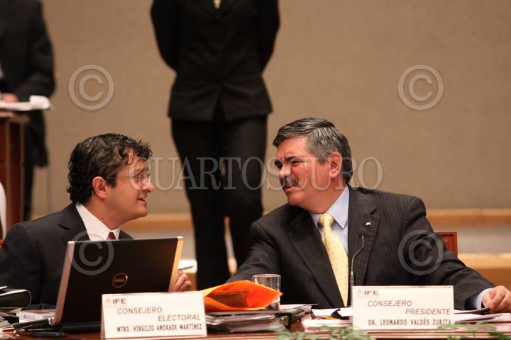 MÉXICO, D.F., 31MARZO2009.- Virgilio Andrade Martínez, consejero y Leonardo Valdés Zurita, Consejero Presidente, durante la sesión del consejo general del Instituto Federal Electoral. FOTO: MOISÉS PABLO/CUARTOSCURO.COM